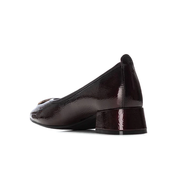 Esta bailarina Carmela en color burdeos es el calzado que convierte cualquier look sencillo en algo especial. El acabado charol con adorno en la parte delantera le da un aire elegante sin ser recargado, lo justo para llevarla tanto a la oficina como a una cena.